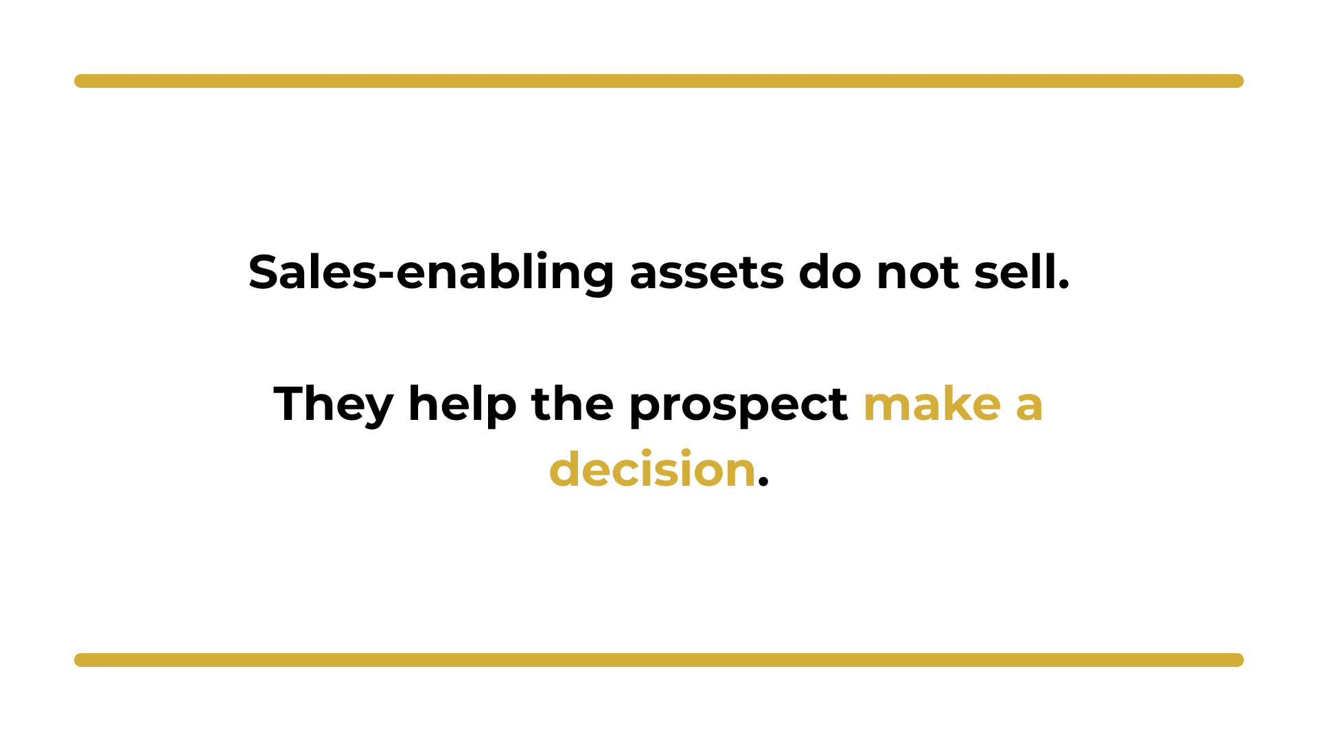 The essence of leveraging sales-enabling assets is to naturally guide the prospect with high-value assets (that you can automate or semi-automate) so that by the time they get to that final sales meeting, they are as close to doing business with you as humanly possible.